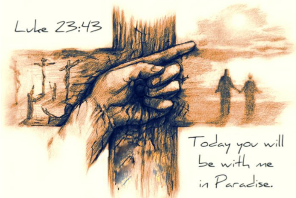 One of the criminals who were hanged railed at him, saying, “Are you not the Christ? Save yourself and us!” But the other rebuked him, saying, “Do you not fear God, since you are under the same sentence of condemnation? And we indeed justly, for we are receiving the due reward of our deeds; but this man has done nothing wrong.” And he said, “Jesus, remember me when you come into your kingdom.” And he said to him, “Truly, I say to you, today you will be with me in paradise.”